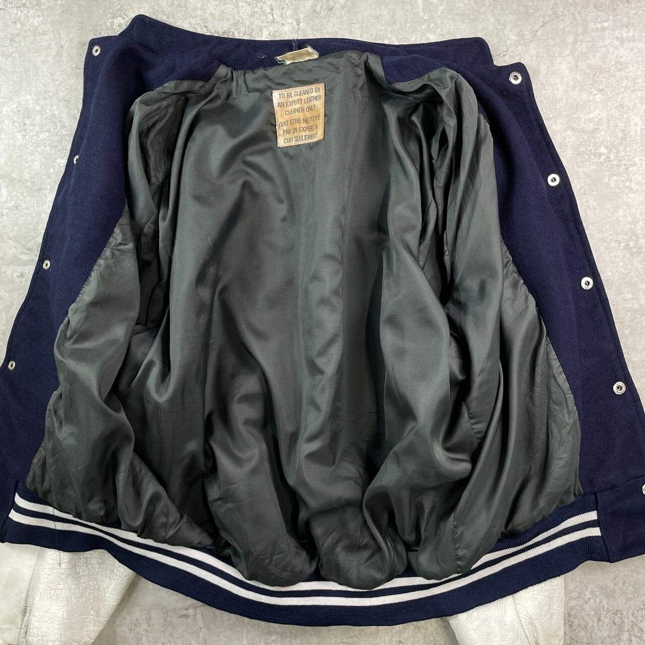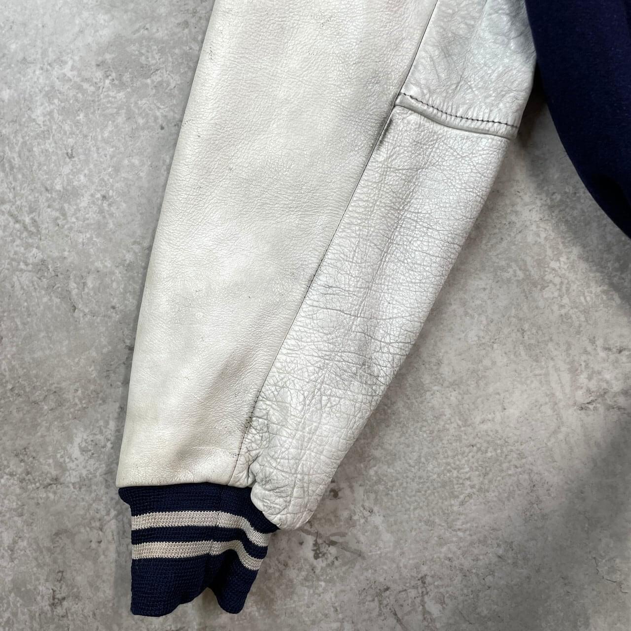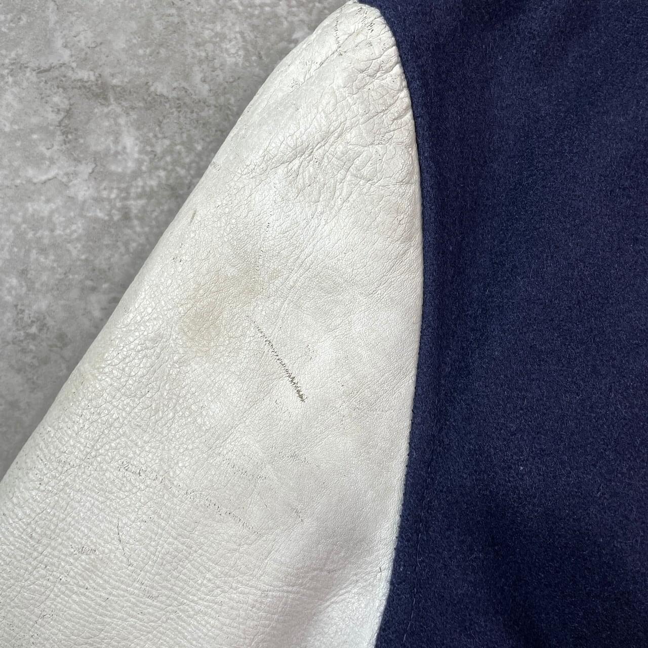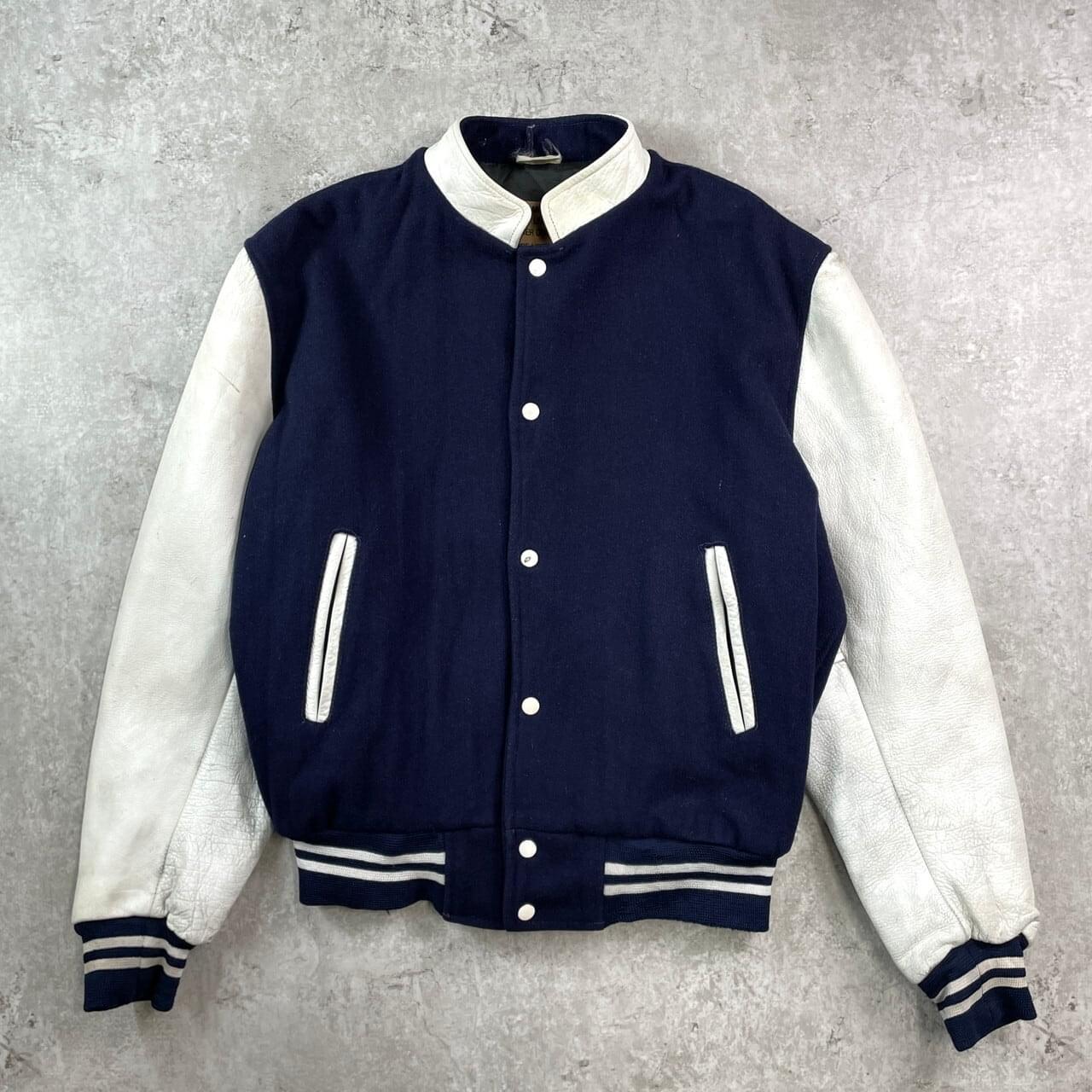■スタンドカラー 袖革 ウールスタジャン メンズL相当 古着 スタジアムジャケット アワードジャケット 立ち襟 ダークネイビー ホワイト 白【ブルゾン・ジャケット】/ネイビー 【サイズ】 表記 不明(着用感メンズL相当) モデル身長172cm ※計測値をご確認ください。 着丈…68 身幅…68 肩幅…53 袖丈…67 【生産国】不明 【素材】不明 【状態】袖や袖リブなどに汚れがございます。 画像にてご確認ください。 【c251115007】 ※古着は洗濯、検品などのケアを行っております。(新品・デッドストックは洗濯していません。) ※モニターの発色により実物と異なる場合がございます。予めご了承ください。 ※ 海外直輸入USED品になります。