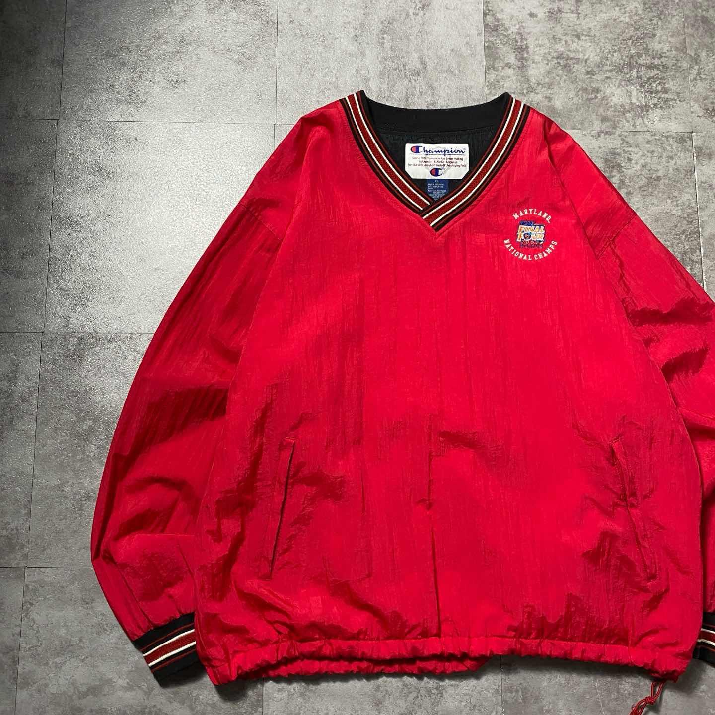 【XL】90s チャンピオン 刺繍ロゴ ラインリブ レッド ナイロンプルオーバー