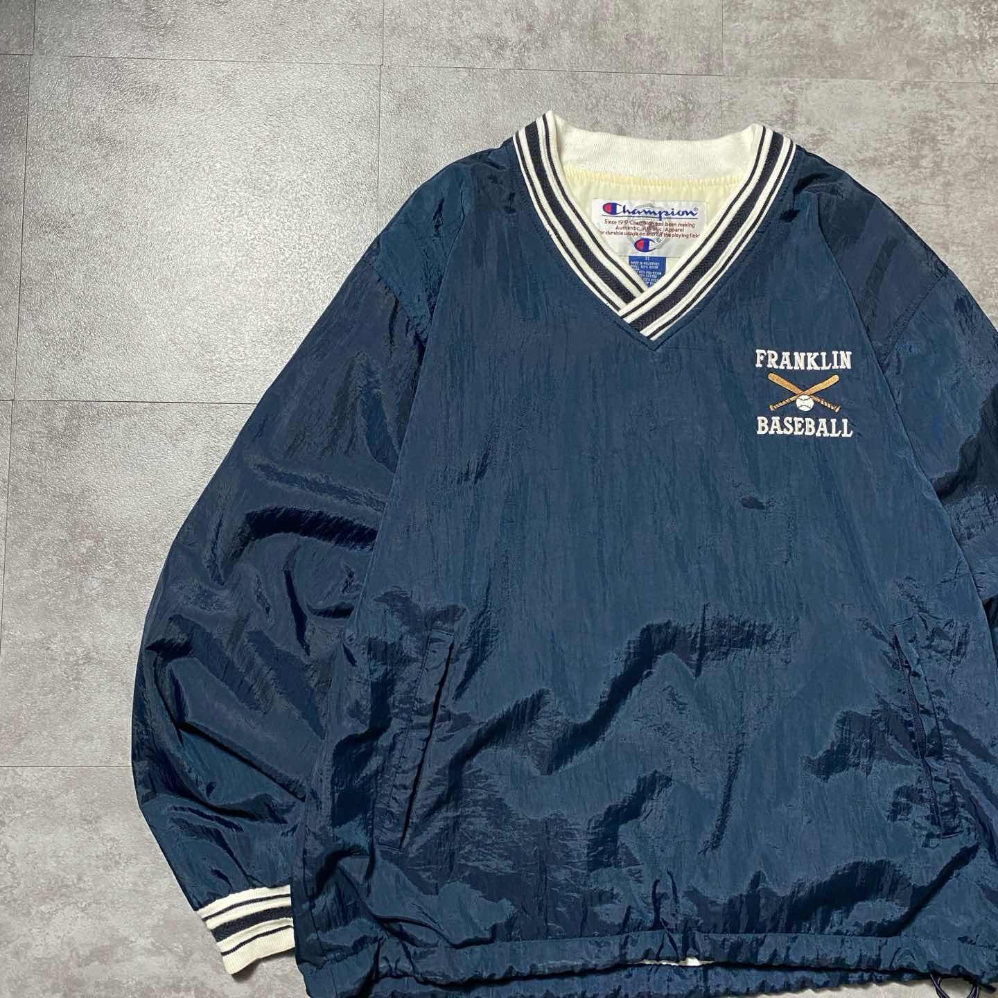 90s チャンピオン 刺繍ロゴ ラインリブ ネイビー ナイロンプルオーバー