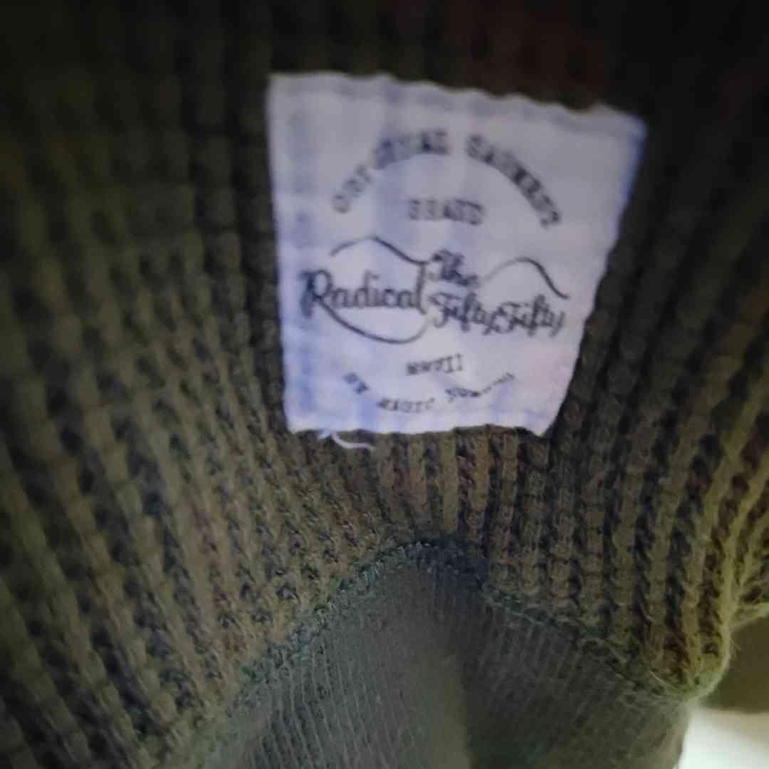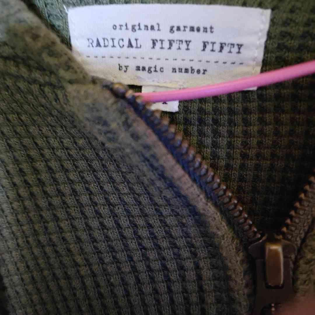 RADICAL FIFTY FIFTY by magic number のワッフル(サーマル)ジップパーカー。 凹凸のある生地で通気性がよく、春秋の羽織り〜冬のインナーまで長く使えます。 ストレッチ入りで着心地も◎。定番のカーキで合わせやすい1枚です。 サイズ:M(実寸は後述)/フルジップ・フード付き・ポケットあり。