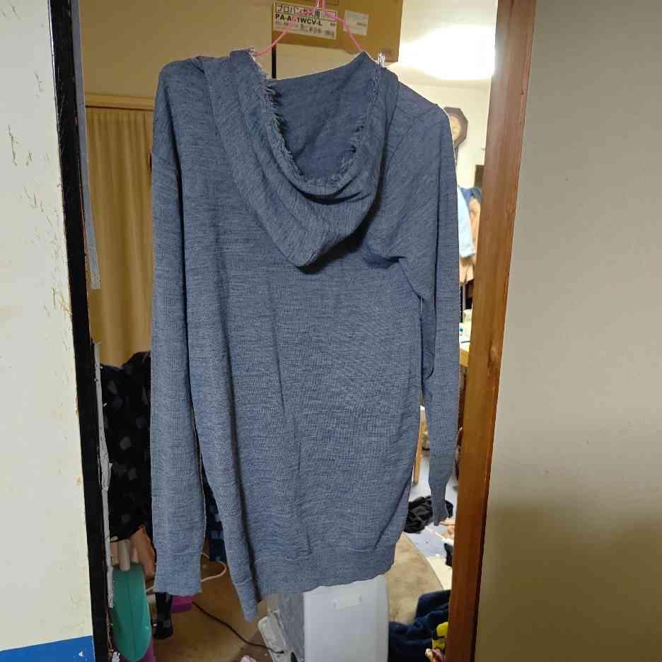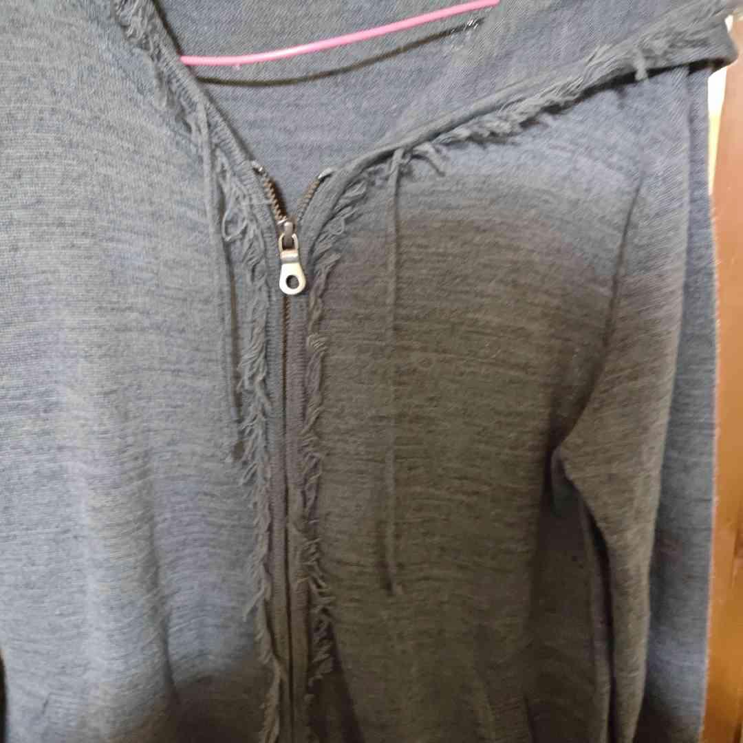 MORGAN HOMME のフード付きフルジップ。 フード周り〜前立ての切りっぱなし風デザインがアクセントで、羽織るだけで雰囲気が出ます。 薄手でレイヤードしやすく、春秋はアウター代わり、冬はインナーにも◎。 サイズ:M(実寸ご確認ください)/カラー:グレー系。