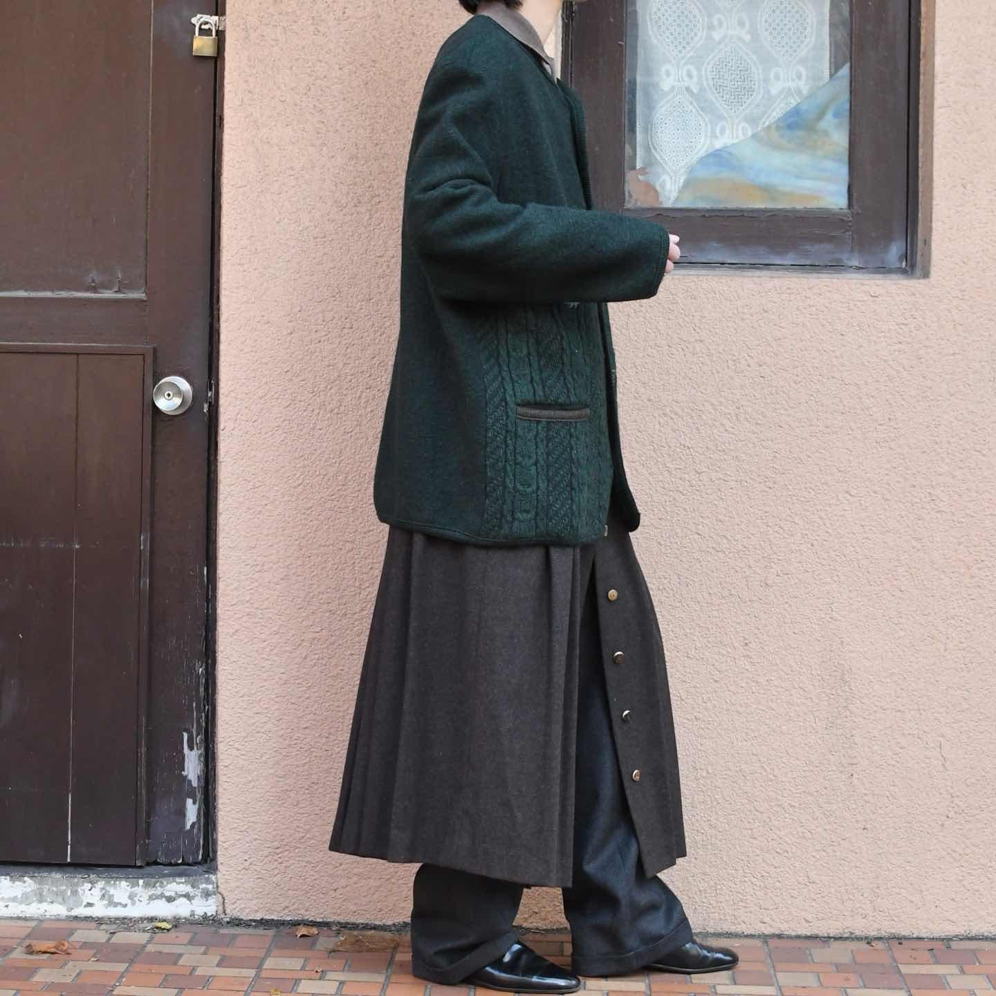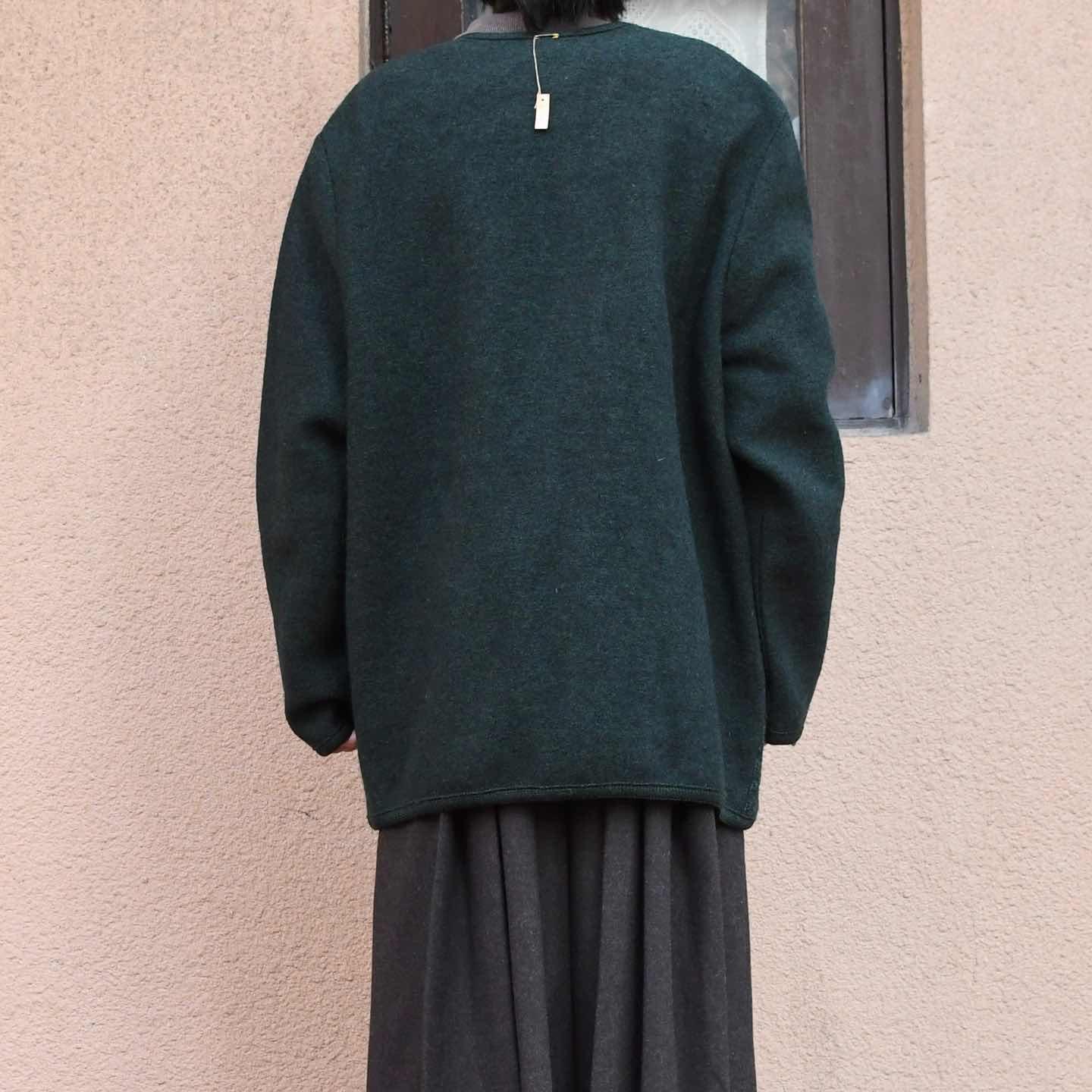SIZE:52 着丈80cm 肩幅52cm 身幅68cm 袖丈68cm fabric/pure new wool made in Austria 着用画像 173cm/56kg 鹿とオジ、そしてエーデルワイス。 チロリアンアイテムらしい装飾や、ケーブル編みの ニット生地との切り替えなど派手過ぎない 上品なデザインに惹かれました。 カーディガンと呼ぶべきか、 ジャケットと呼ぶべきか、迷うところですが 作りはカーディガン、厚みはウールジャケットと 言ったところでしょうか、風を通さないしっかりと 厚みのある生地感で、ノーカラーだからこそ シャツやニットポロの襟を出して楽しめる 逸品です。 オーバーサイズで、下のボタンをいくつか外して 着崩すスタイルでどうぞ。 ※撮影状況により、実物と多少色が異なる場合が ございます。 ※古着を取り扱っているため、気づかない汚れや ほつれ等がある場合がございます。 ※サイズは着用感で選んでおり、 表記サイズは説明欄の最初に記載しております。 古着 オーバーサイズ old vintage ヴィンテージ used 80's 90's アメリカ古着 ユーロ古着 POLO RALPH LAUREN Eddie Bauer OLD GAP LANDS' END ランズエンド LLBean エルエルビーン オールドギャップ エディーバウアー ラルフローレン ブルックスブラザーズ Brooks Brothers 深緑 ダークグリーン ニット セーター ジャケット ノーカラー などがお好きな方 #vintage #オーバーサイズ #old #used #90s #80s #古着 #ヴィンテージ #アメリカ古着 #ユーロ古着 #LLBean #エルエルビーン #EddieBauer #エディーバウアー #oldgap #ラルフローレン #POLORALPHLAUREN #チロリアン #ウールジャケット #ジャケット #カーディガン