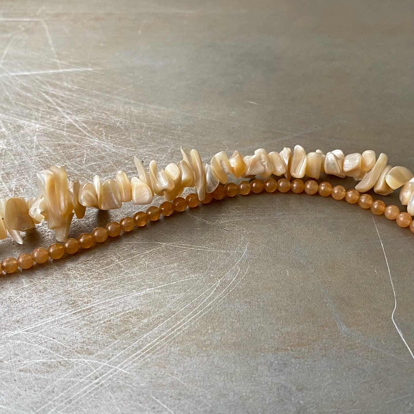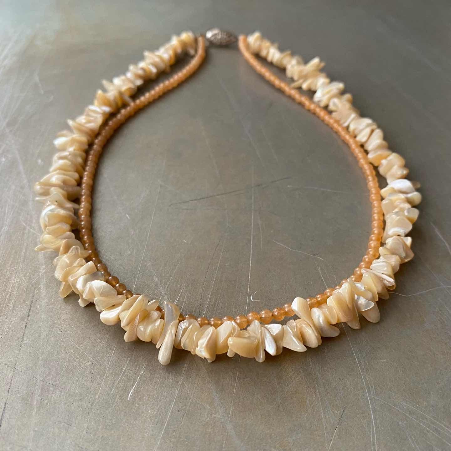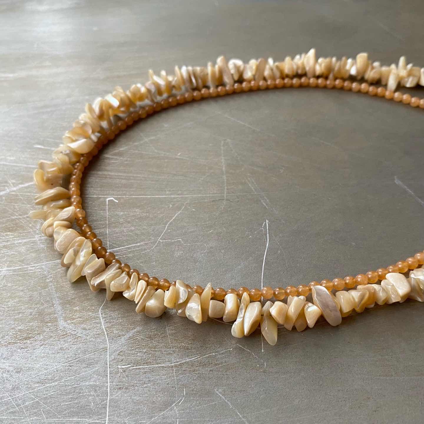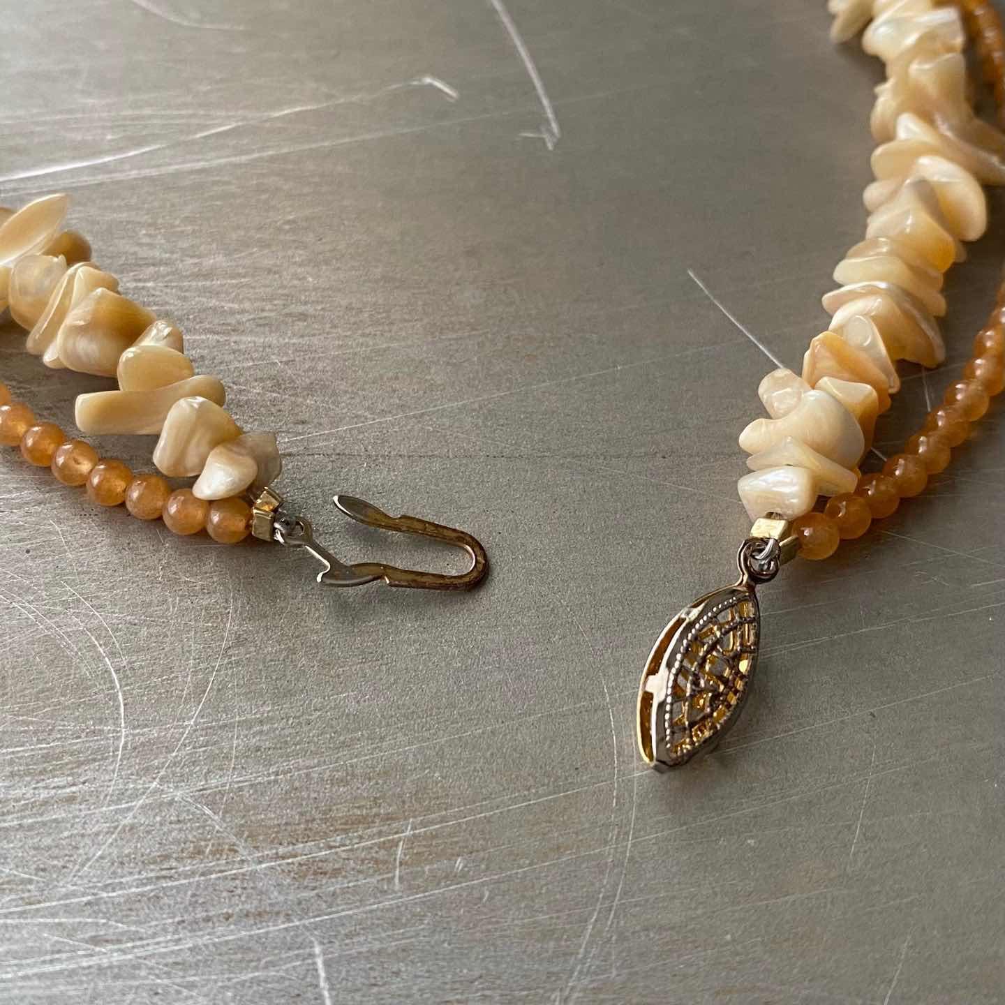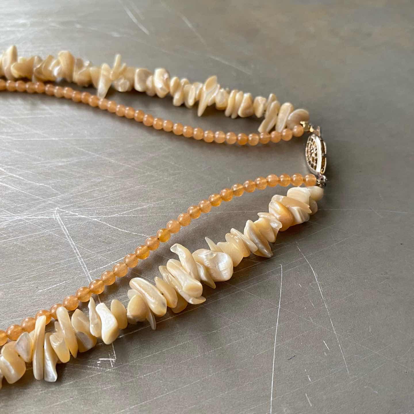 ラフカットのシェルと繊細なストーンの組み合わせが魅力的なUSAヴィンテージネックレス。真珠の母貝である「マザーオブパール」は持ち主の心を癒し、「レッドアベンチュリン」は、心身のバランスを整えてくれると言い伝えられています。レトロな金具もお洒落なポイント。肌馴染みの良い色合いでコーディネートにお洒落な雰囲気をプラスしてくれます。 □Materials 天然石(マザーオブパール・レッドアベンチュリン)、メタル(シルバーメッキ) □Size 全長 約44㎝ 幅 約(シェル)1.3㎝/(レッドアベンチュリン)約3㎜ 38g □Condition【S】 デッドストック(未使用品)です。画像の通り金具部分に経年による変色がみられます。中古品であることをご理解のうえお買い求めください。ご購入前に必ずショッピングガイドのご確認をお願いいたします。 【S】未使用 【A】未使用に近い 【B】やや使用感あり 【C】使用感あり Item No.3575