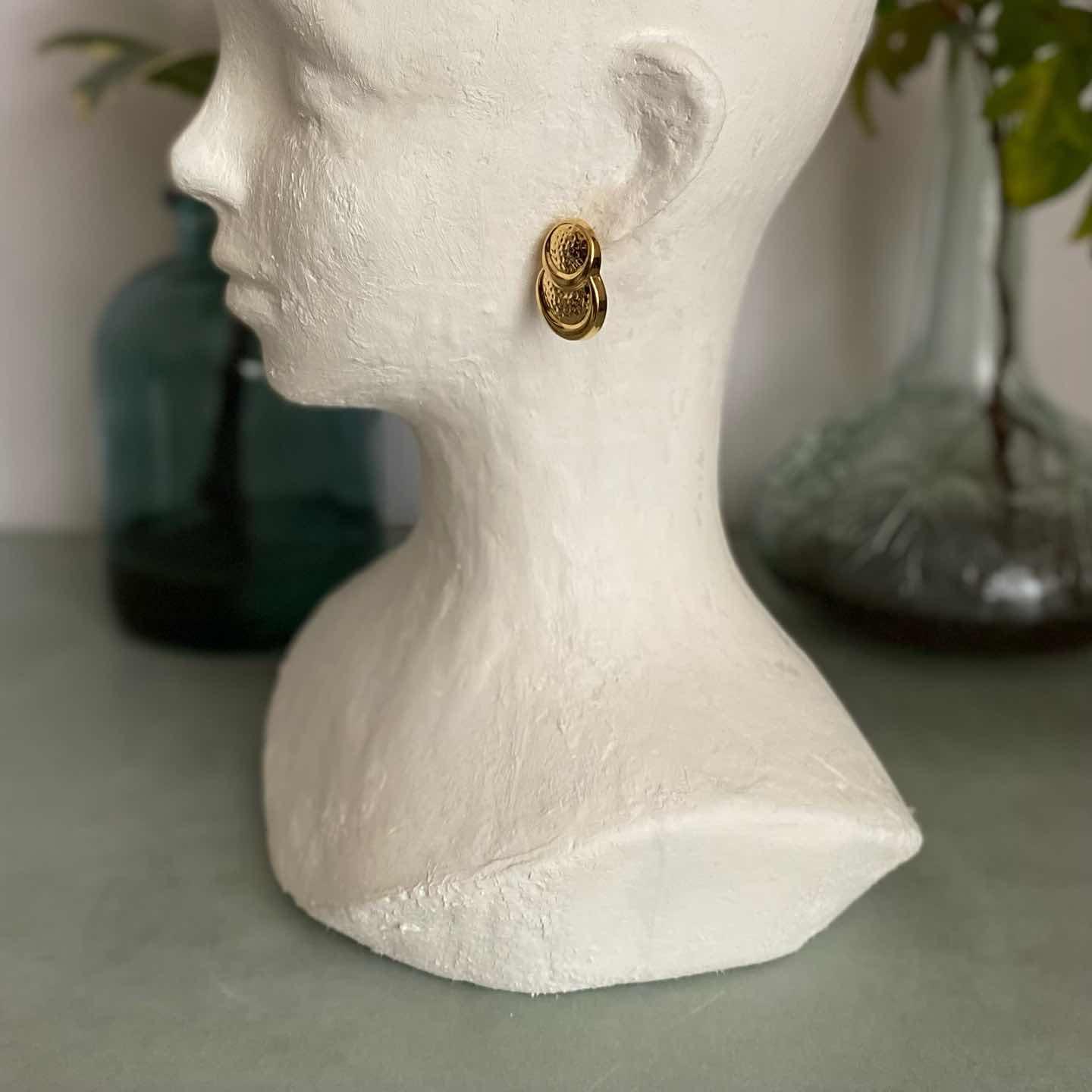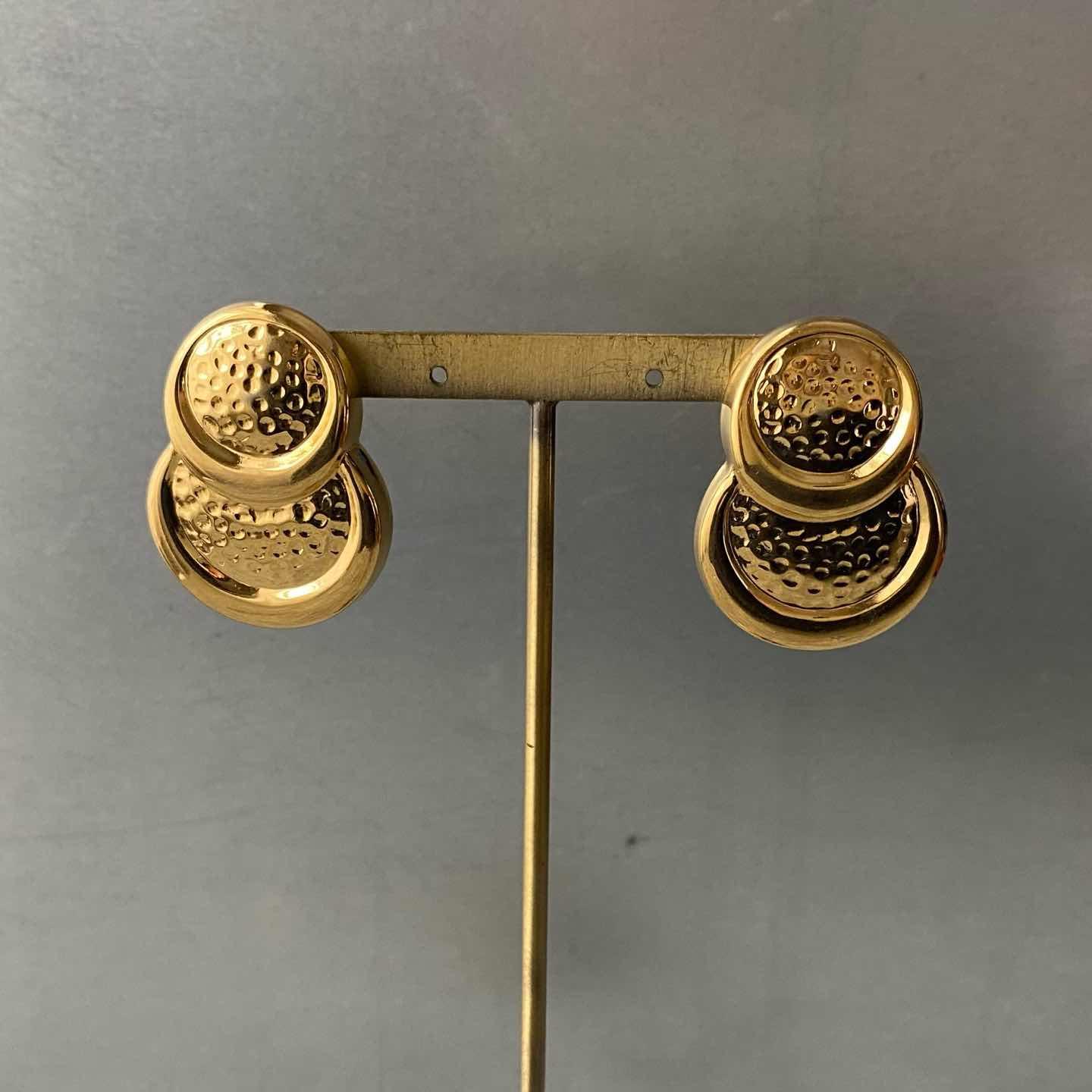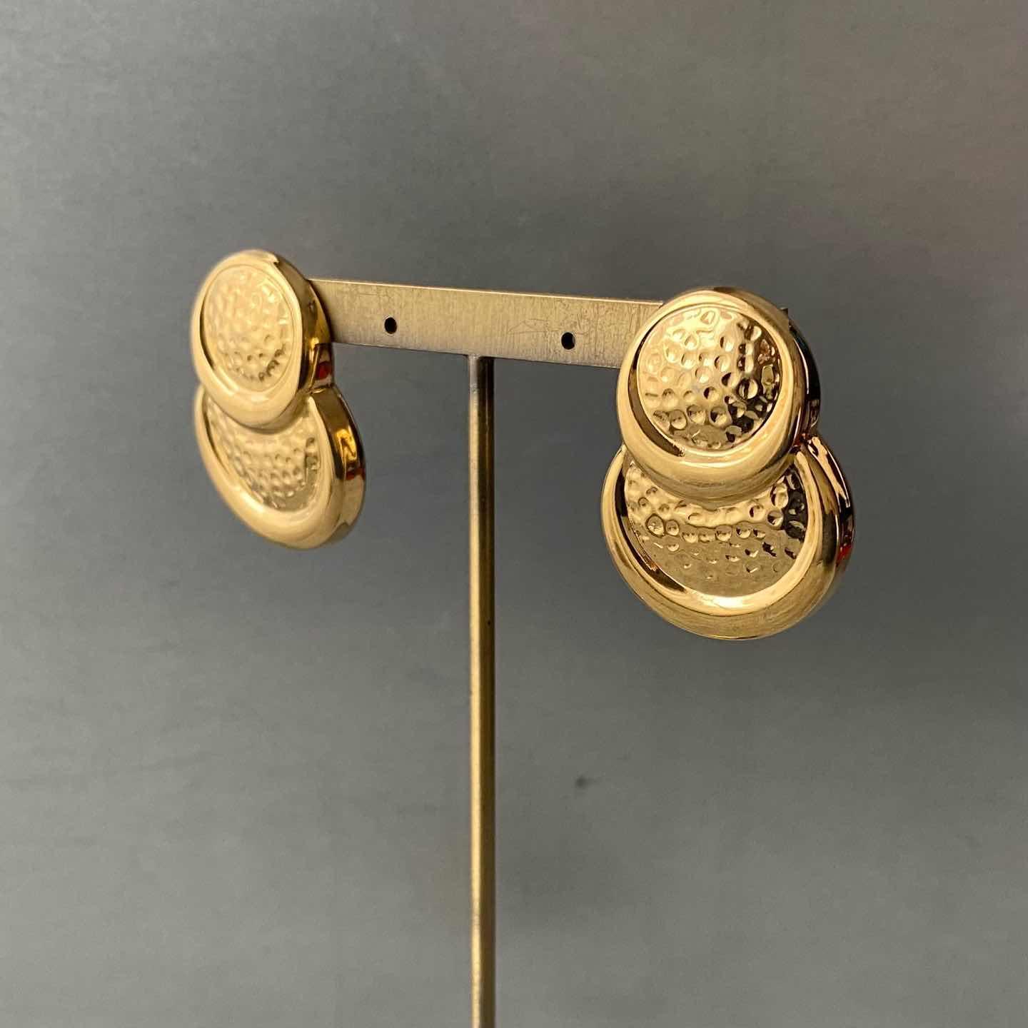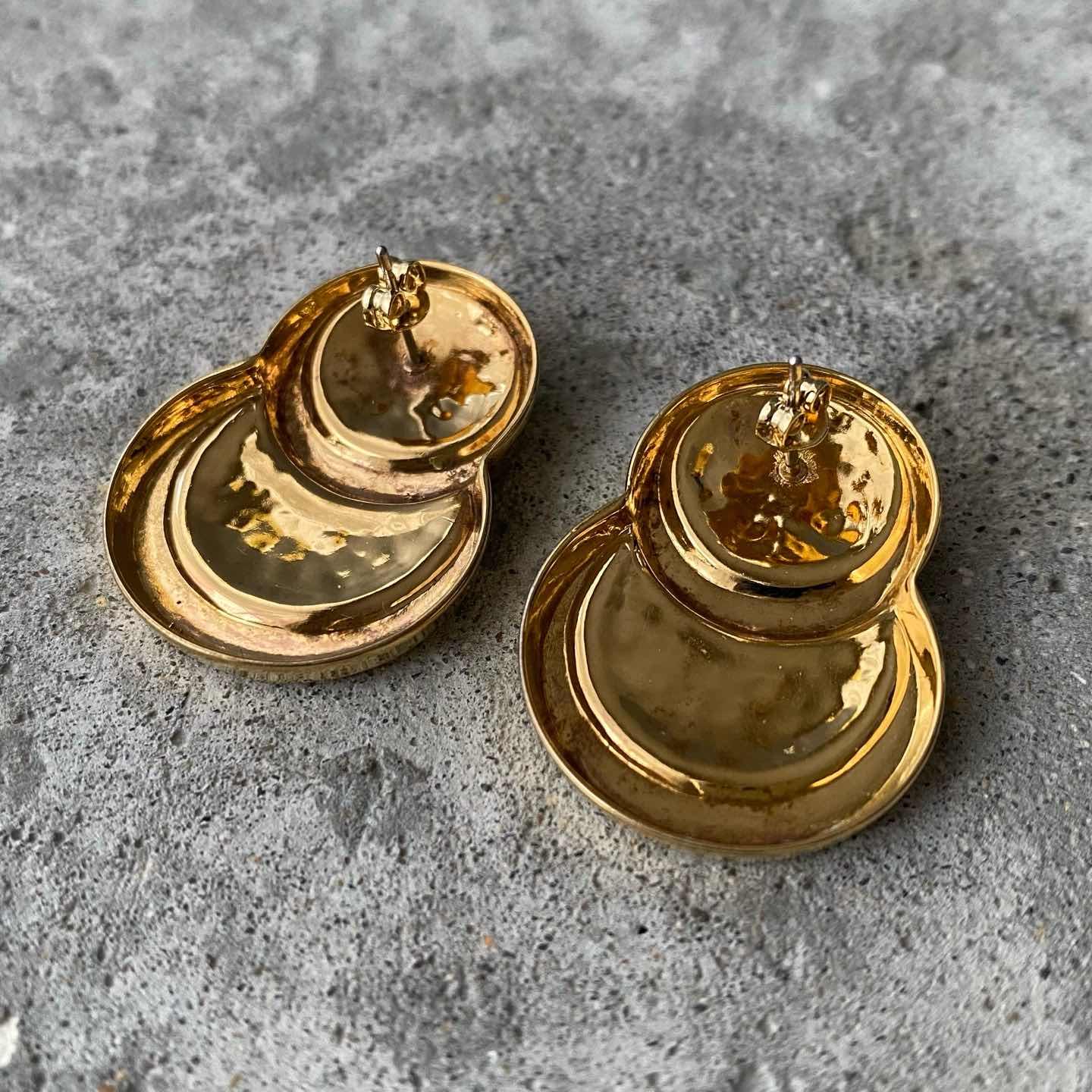 「月と太陽」をイメージさせる個性的なデザインのUSAヴィンテージピアス。シンプルながら存在感があり、スタイリングにお洒落な雰囲気をプラスしてくれます。 □Materials メタル(ゴールドメッキ) (※ピアスキャッチは新品のものに交換してまいます) □Size 約H3.2×W2.4㎝ 12g □Condition【C】 メタル部分に多少のスレや裏側に変色がみられます。中古品であることをご理解のうえお買い求めください。ご購入前に必ずショッピングガイドのご確認をお願いいたします。 【S】未使用 【A】未使用に近い 【B】やや使用感あり 【C】使用感あり Item No.3577