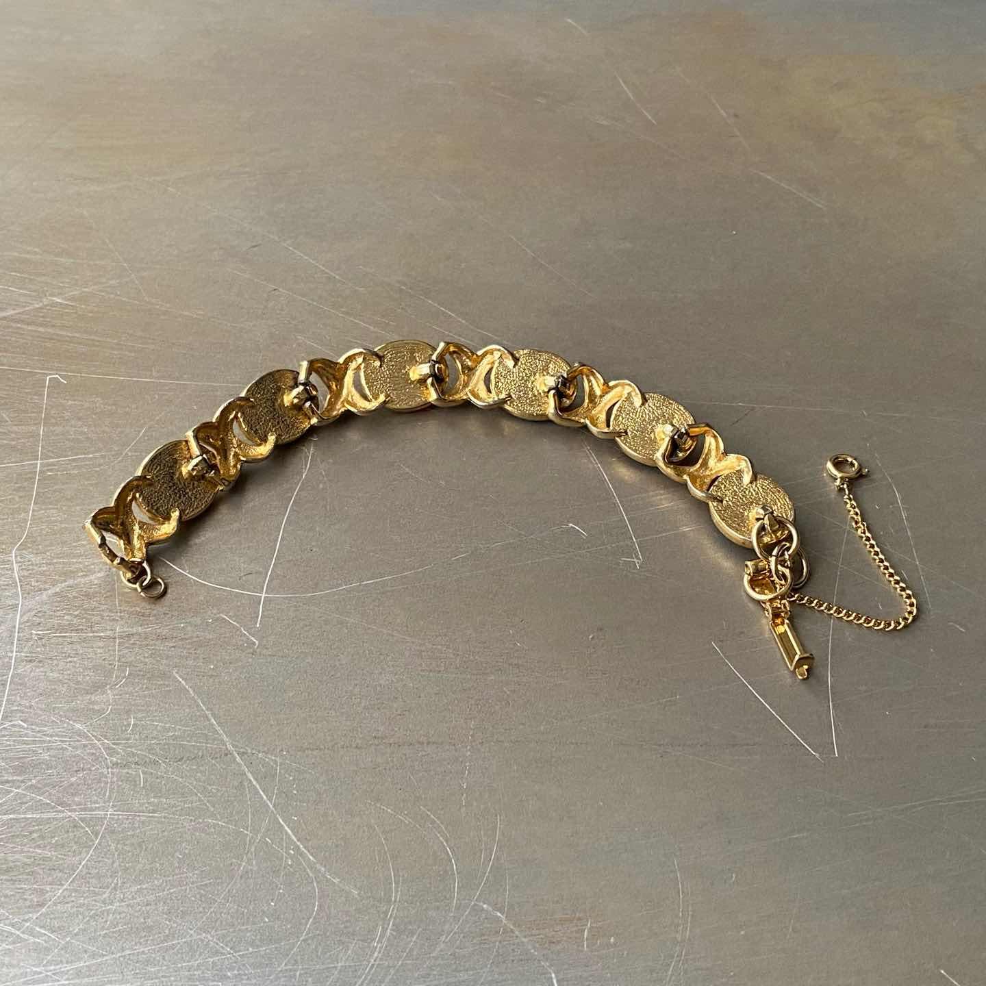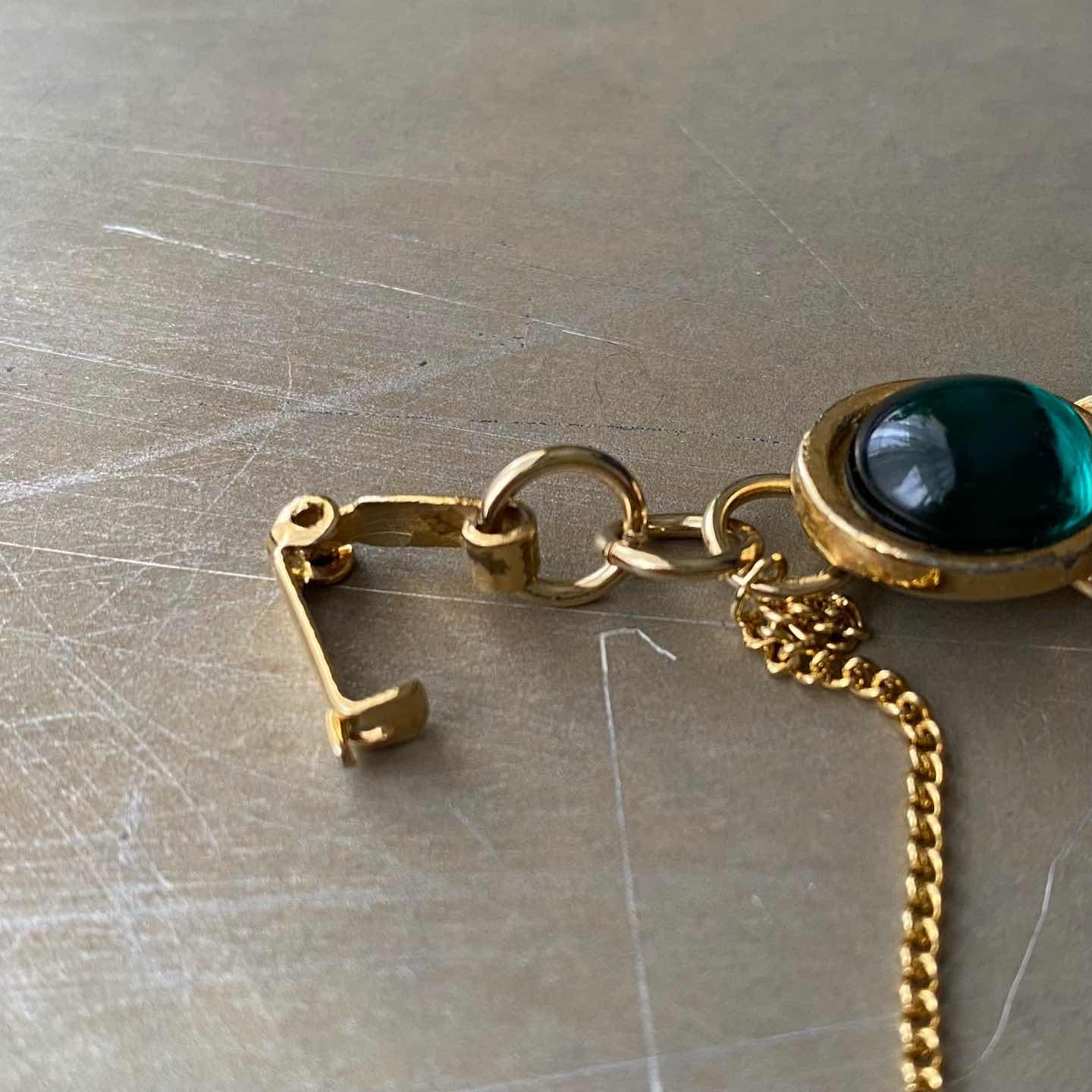 クラシカルな雰囲気のUSAヴィンテージブレスレット。カラフルなビジューが輝く華やかなデザイン。揺らめくセーフティーチェーンもお洒落なポイント。重厚感のあるしっかりとした作りで大人の古着スタイルにもおすすめです。 □Materials メタル(ゴールドメッキ)、イミテーションストーン (※マルカン、引き輪は新品のものに交換しています) □Size 全長 約16.5㎝ 幅 約1.3㎝ セーフティーチェーン 約7㎝ 31g □Condition【C】 画像の通り経年によるメタルの変色や剥がれ、凹み傷、ビジューに多少のスレがみられます。古びた雰囲気がお好きな方におすすめです。中古品であることをご理解のうえお買い求めください。ご購入前に必ずショッピングガイドのご確認をお願いいたします。 【S】未使用 【A】未使用に近い 【B】やや使用感あり 【C】使用感あり Item No.3576