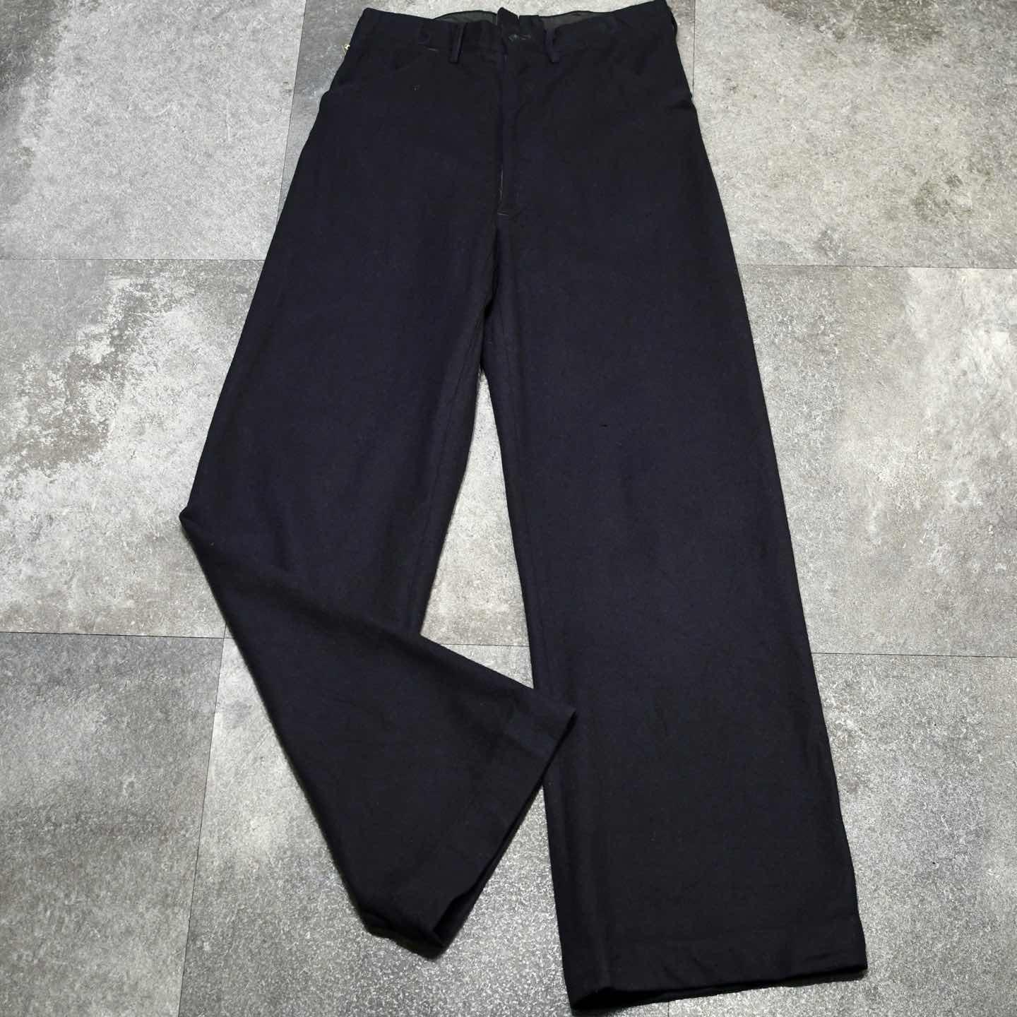 SIZE:- ウエスト74cm 総丈116cm 股下83cm わたり35cm 裾幅31cm fabric/wool 着用画像 173cm/56kg アメリカ軍のセーラーパンツといえば、 フロントに付く”あの前立て”ですが、 こちらは個人的にもずっと探していた ジップフライタイプ。 前立てが付くタイプと比べると、ポケットの浅さや 利便性から、こちらのタイプの方が気軽に穿けるのは言わずもがな。 そしてセーラーパンツ特有の、ズドンとワイドな シルエット。 ミリタリーアイテムだけでなく、古着で見掛ける パンツの中でも群を抜くシルエットの良さ... すこぶる推しです。 ※左太腿付近に2箇所ピンホールあり。 ※裾上げ等のレングス直しにつきましては、 購入前に、必ずご連絡お願い致します。 ※撮影状況により、実物と多少色が異なる 場合がございます。 ※古着を取り扱っているため、気づかない汚れや ほつれがある場合がございます。 ※サイズは着用感で選んでおり、 表記サイズではございません。 表記サイズは説明欄の最初に記載しております。 オーバーサイズ old vintage ヴィンテージ used 80's 90's POLO RALPH LAUREN Eddie Bauer OLD GAP LANDS' END ランズエンド LLBean エルエルビーン オールドギャップ エディーバウアー ラルフローレン ブルックスブラザーズ Brooks Brothers アメリカ軍 ウールパンツ ワイドパンツ ミリタリー 50's usarmy フランス軍 イタリア軍 イギリス軍 スウェーデン軍 チェコ軍 などがお好きな方 #vintage #old #used #90s #80s #古着 #ヴィンテージ #ラルフローレン #POLORALPHLAUREN #セーラーパンツ #40s #usnavy